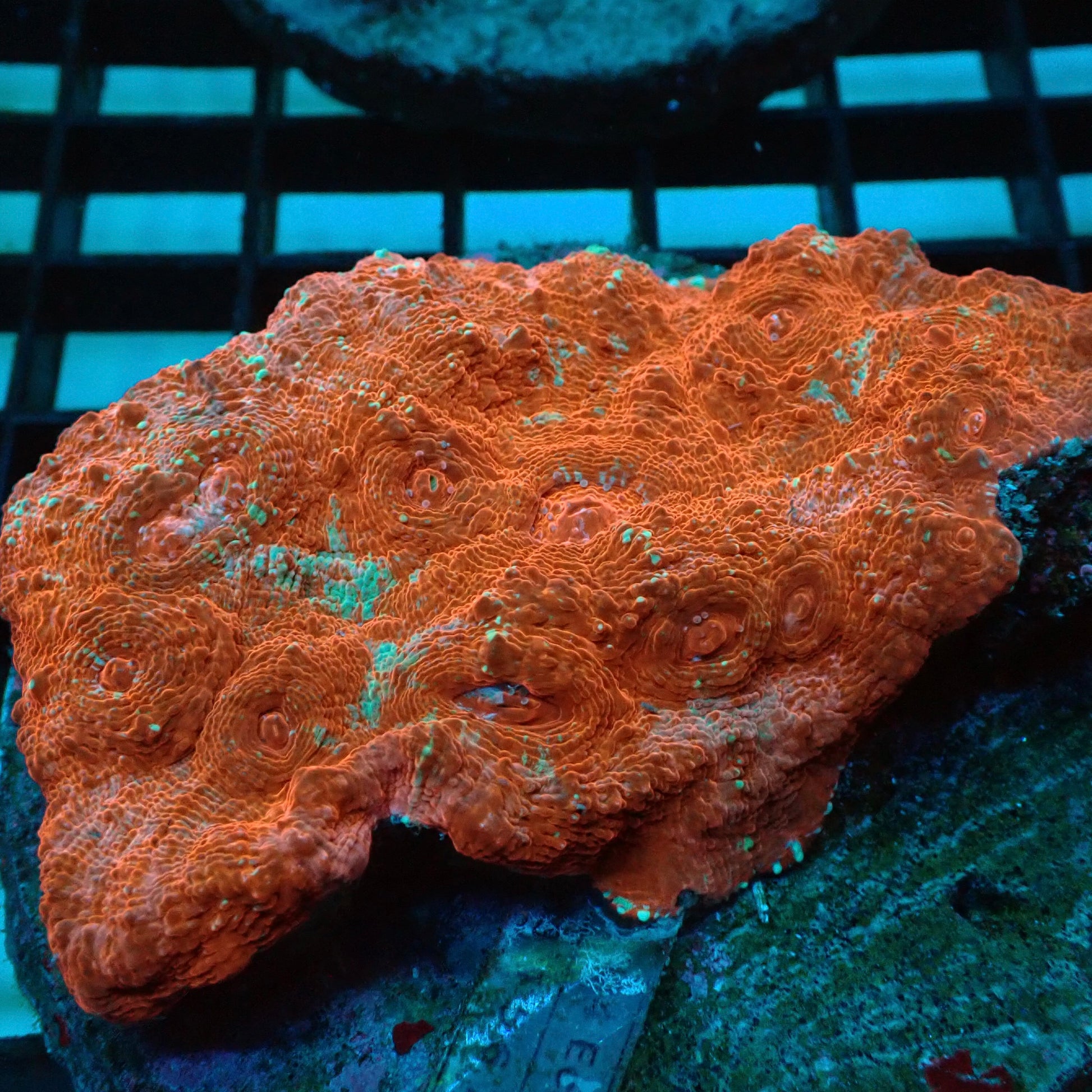 Flame Red & Green Chalice is a high-contrast chalice with a glowing green base and deep flame red patterning that pops under blue reef lighting. It is a lower to moderate light LPS that grows by encrusting and plating outward, building a colourful rim and textured surface as it spreads. Place it with gentle, indirect flow and give it space, and it will settle in and start putting on visible growth.