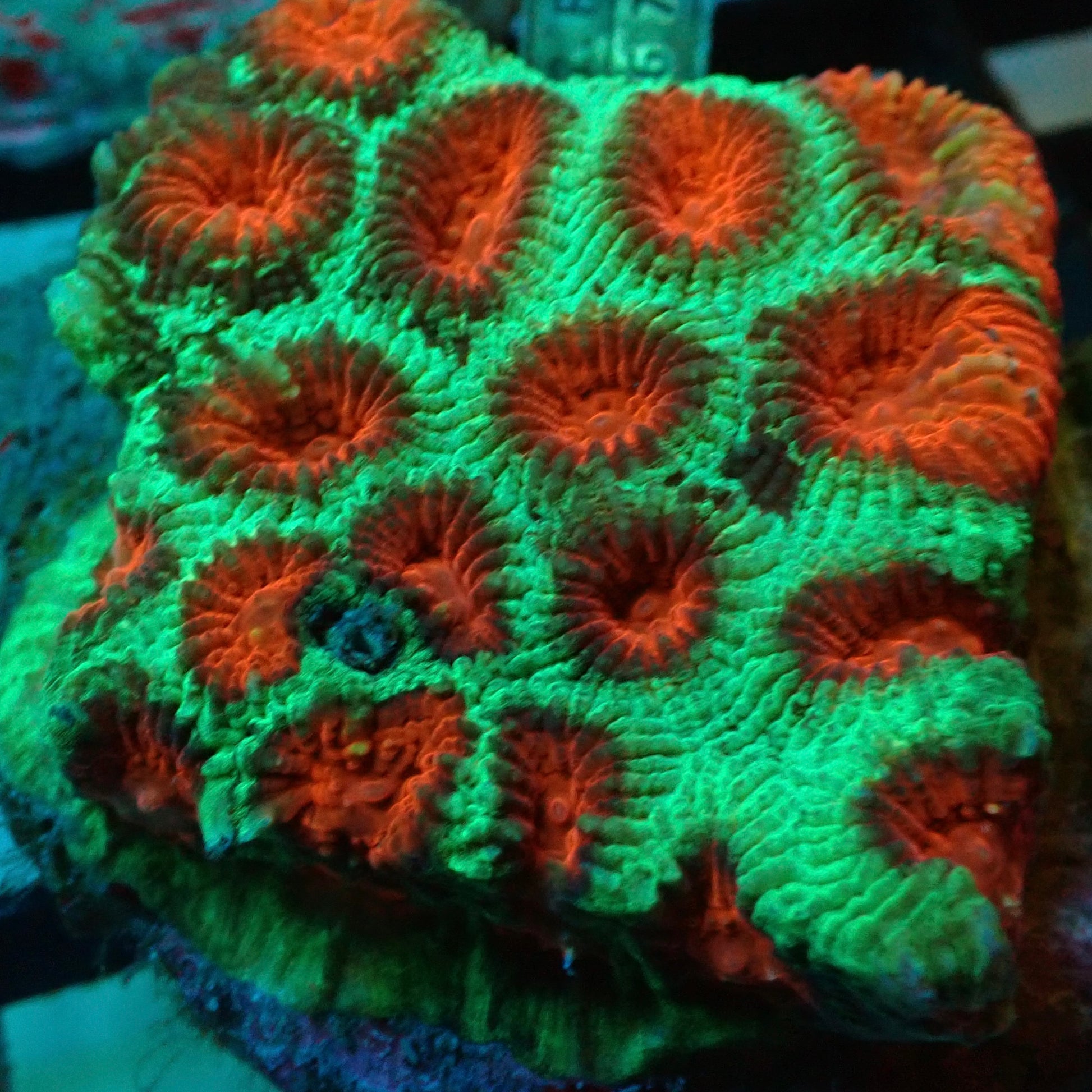 Christmas Favia is a festive, high-contrast favia with rich holiday-style colour and strong fluorescence that really pops under blue lighting. It is a hardy encrusting LPS that adds texture and colour to the reef, and once it settles it will slowly spread over the plug and surrounding rock. A great choice for mixed reefs where you want bold colour without needing high light.