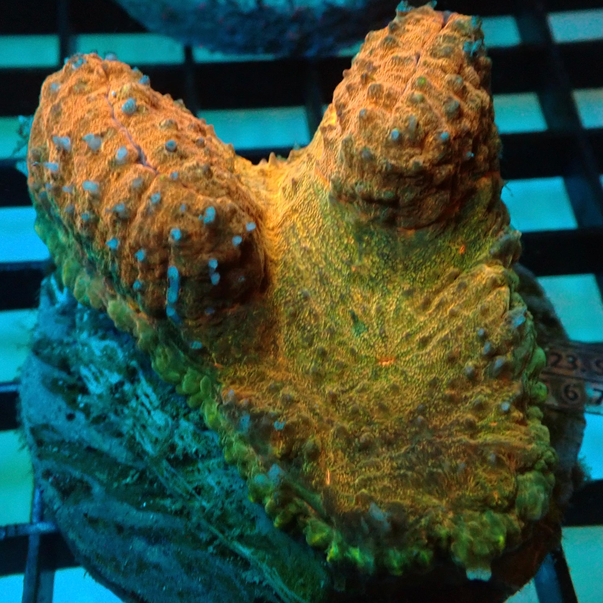 Tricolour Favia is a high-contrast favia with a bright mix of green, orange, and yellow tones that glow under blue reef lighting. It is a hardy encrusting LPS that adds texture and colour without needing high light. Once settled, it will slowly spread over the plug and onto the surrounding rock, building a vibrant, patterned mat over time.